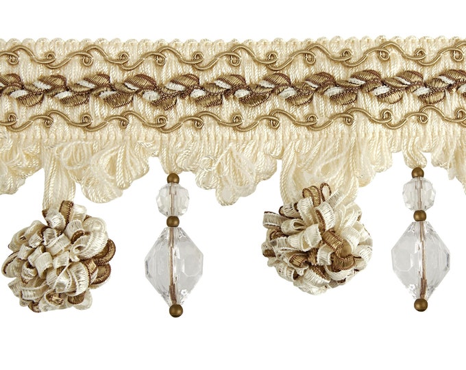 Ecru Beige Beaded Onion Trim Fringe | 8 cm height Tassel fringe trim with beads and balls